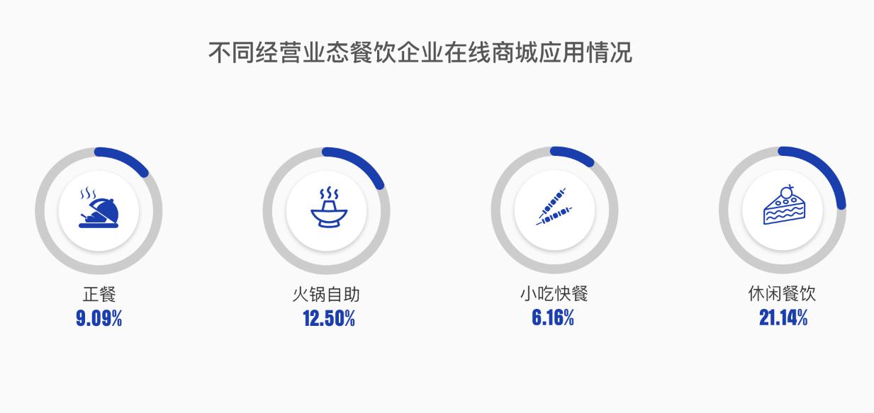 报告调查数据表明,当前超过七成的餐饮企业开通了在线外卖服务,外卖业务已广泛应用于餐饮行业。值得注意的是,连锁餐饮品牌开通在线外卖的比例达到72%,这表明随着消费者消费习惯的转变,连锁餐厅也开始转变经营思路,重视外卖业务。同时,受电商模式的影响,餐饮企业不再单纯经营线下餐饮业务,而是借助线上商城拓展业务范围,通过电商渠道销售与餐厅业务相关的食材、半成品等。报告数据显示,当前约11%的餐厅开通了线上的商城,而休闲餐饮开通在线商城的比重更高达21%。
