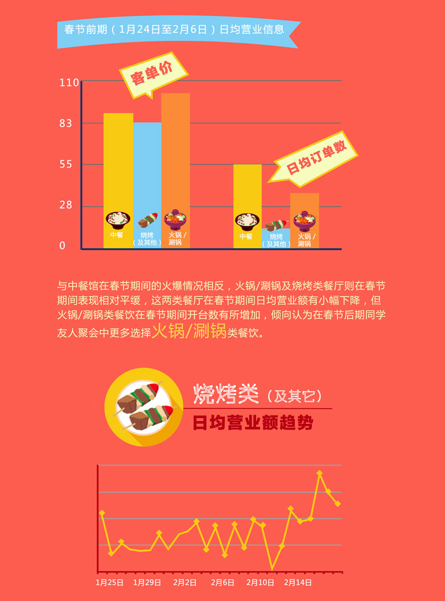 春节期间客单价最高的是中餐;烧烤热销品中肉占绝对主流;火锅热销品中儿时的味道——北冰洋汽水拔得头筹