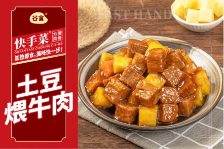 新品谷言快手菜,主打“加热即食,轻松吃大餐”的品牌理念,致力于为广大消费者提供安全、健康、便捷、美味的预制菜肴。以土豆煨牛肉、焦香烤鱼、酸菜汆白肉、毛血旺、水煮肉片、宫保鸡丁、四喜丸子、木须肉、鱼香肉丝等十余道经典名菜为主要产品,只需将菜品简单加热,即可畅享整桌美味。