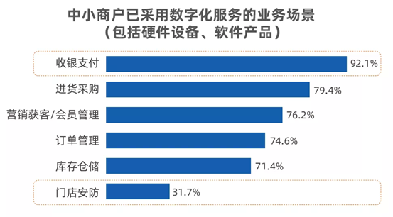 以智能收银为代表的支付设备是推动中小商户数字化的抓手。从门店数字化应用环节占比来看,收银支付的占比高达92.1%,同时,超过70%的受访企业表示在进货采购、营销获客/会员管理、订单管理、库存仓储等环节也采用了数字化服务。