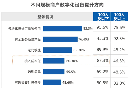 根据调研,不同规模商家均认为操作简便、与其他设备的良好兼容性、价格低廉是数字化硬件设备最核心的三项特质。其中100人以下企业对操作简单和兼容性要求更高。