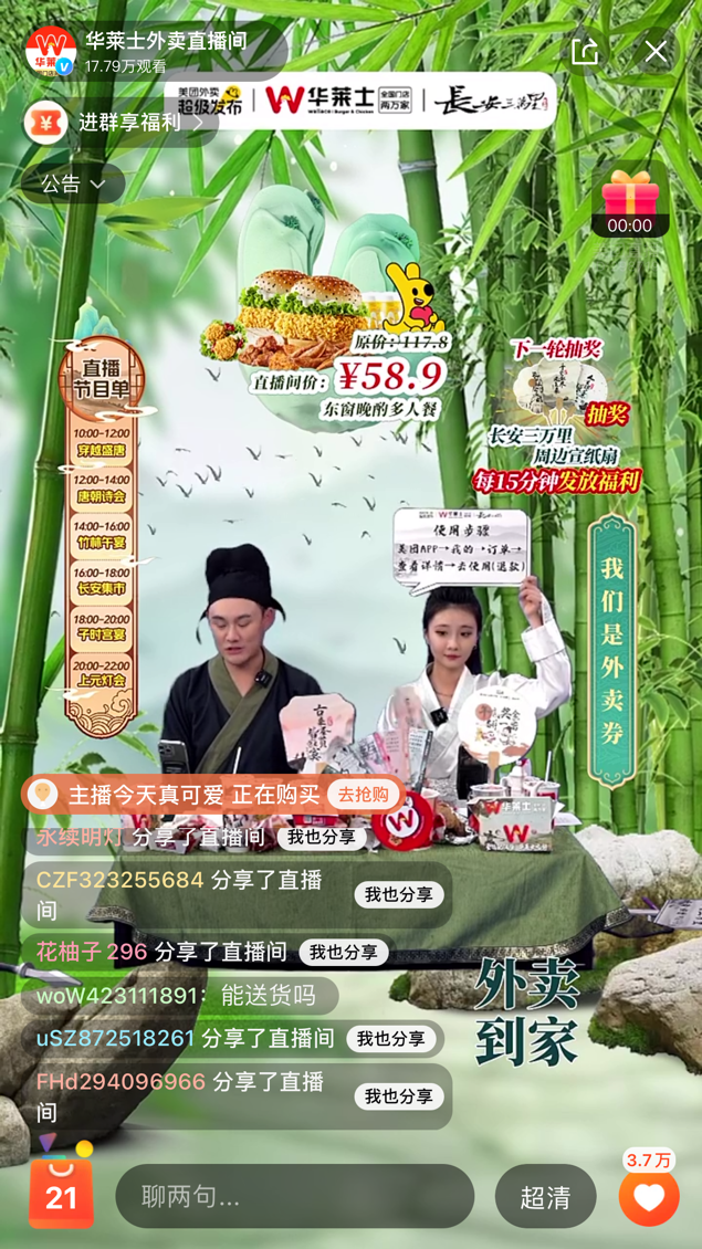 在线下,将华莱士西安纺织城店打造为主题店,带领观众梦回大唐;在店内顾客可以在店内现场体验唐妆,提笔写诗,与“李白”等NPC吟诗歌赋,打造全方位立体化“盛唐穿越”体验。