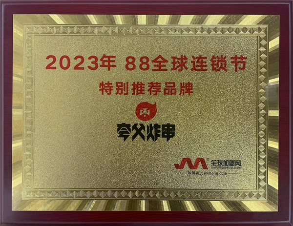 今年8月举办的“全球连锁节高峰论坛”上,夸父炸串荣获“特别推荐品牌”奖项,体现了夸父炸串在加盟创业项目中的综合优势,是创业加盟的首选品牌。