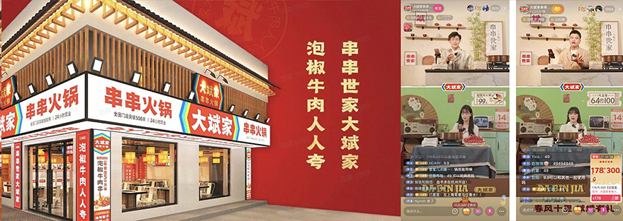 针对火锅的聚餐属性,大斌家打造“代金券主推+单品秒杀+套餐搭配”商品组合,主推多种面额代金券“178代300,49代100代金券”等,满足不同人群聚餐消费场景。 同时,大斌家创意打造“同屏双城双场景”直播——长沙、南京双城连线,两地主播分别在简约现代和复古国风的场景中,开启招牌菜“泡椒牛肉串串”吃播,与用户互动抽取福袋大礼,持续推动热度升温。将抖音首播打造成年度营销大事件,快速打入目标消费群体,让大斌家不仅收获810万销售额,更达成了近1000万的直播曝光量,以大场直播实现“品效合一”。
