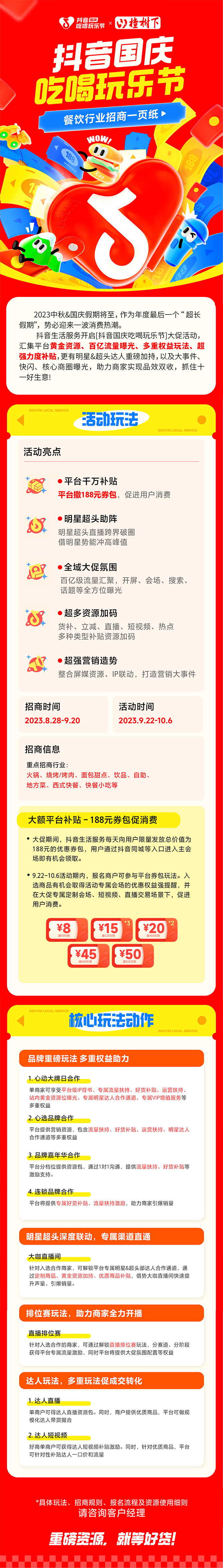 今年,针对火热的十一黄金周假期到来,抖音生活服务特推出“抖音国庆吃喝玩乐节”,用百亿流量曝光资源、多重权益玩法,助力餐饮商户抓住十一黄金周:
