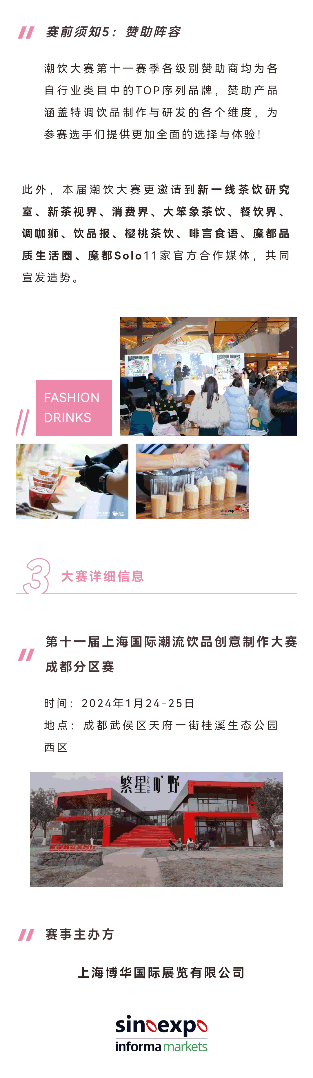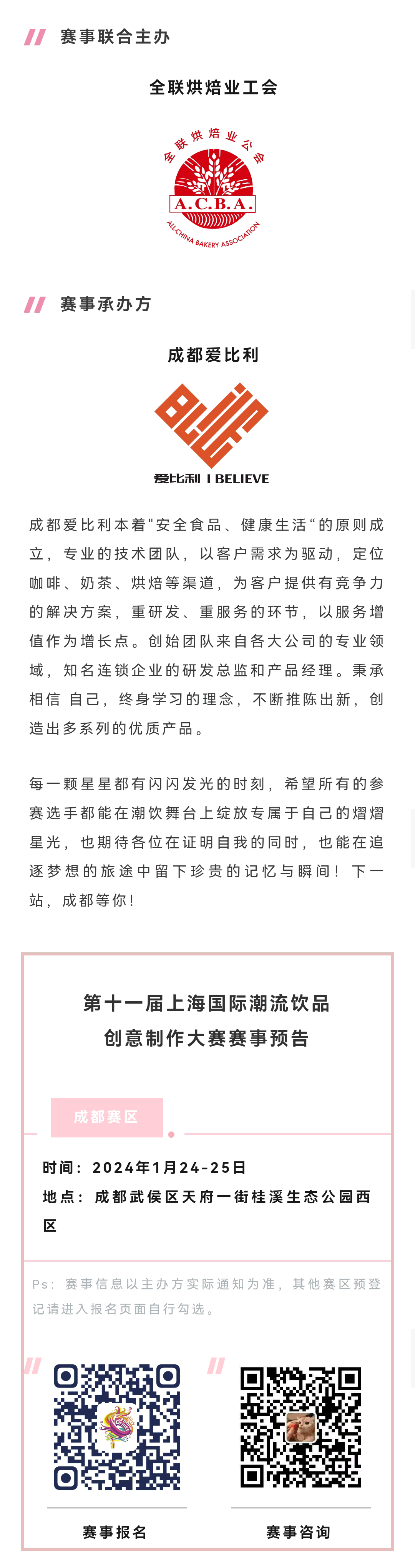第十一届上海国际潮流饮品创意制作大赛成都分区赛将于2024年1月24-25日落地成都武侯区天府一街桂溪生态公园西区,选手招募火热进行中!