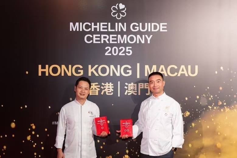图片说明:淮扬晓宴高级主厨肖飞(右)及澳门四季酒店中餐厅行政总厨何鑫涛出席《香港澳门米其林指南2025》典礼。