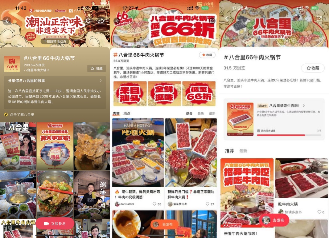 3万+份嫩肉在平台上几乎被“秒空”,八合里66牛肉火锅节的“热度”再次飙升。截至6月6日,“八合里66牛肉火锅节”全平台的笔记数量达到13万+篇。