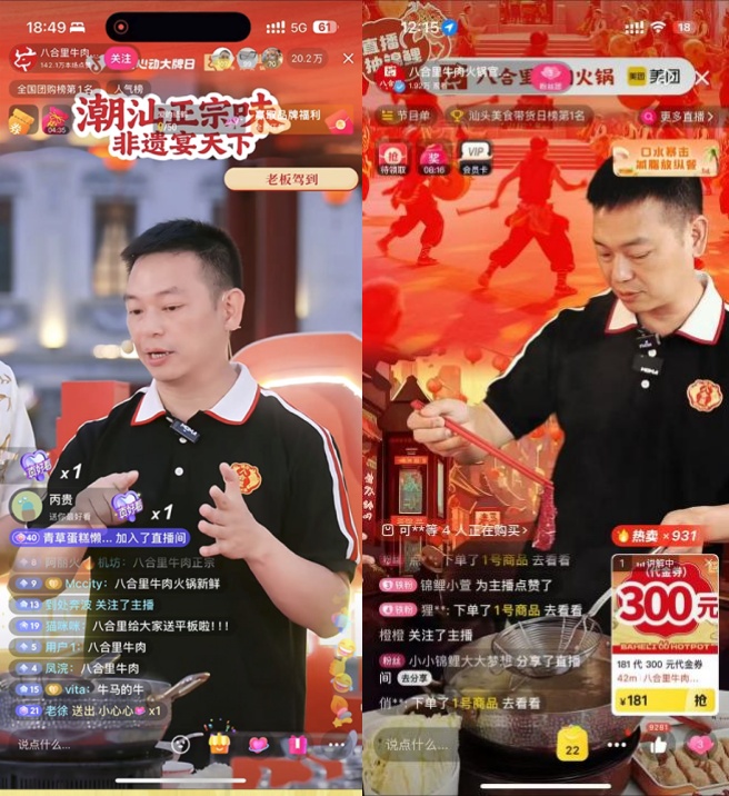 6月6日,八合里牛肉火锅更是将直播间搬进了同期举行的“汕头牛肉活动周”现场。汕头牛肉活动周是由汕头文化广电旅游体育局(文物局)、汕头市市场监督管理局指导,汕头市美食学会、汕头牛肉丸产业联合会、广东省粤东技师学院等单位主办、广东八合里控股有限公司等单位联合主办的一次盛会。八合里牛肉火锅将镜头对准“庖丁解牛”、“手打牛肉丸”等比赛现场,将直播间人气推向新高峰。