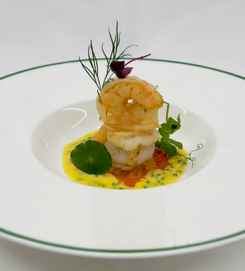正宗法式小酒馆巴黎人法式餐厅推出四道菜套餐,其中包括牛油茴香酒火焰大虾伴藏红花番茄甜椒汁,和香槟汁蒸鳕鱼柳伴海鲜慕斯及小麦烩饭。