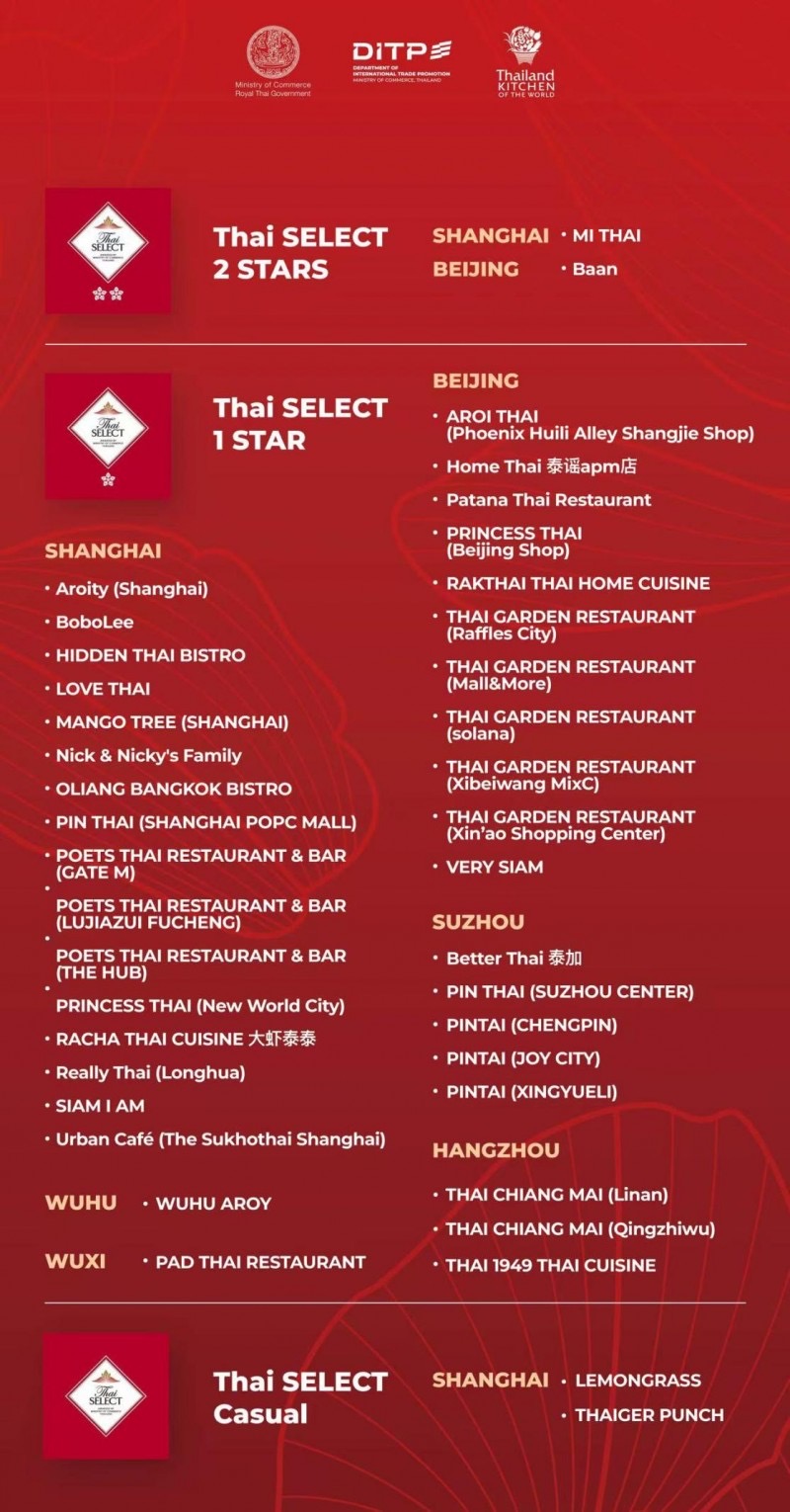 在本年度“泰精选”认证颁奖典礼上,共有41家来自中国的餐厅凭借其出色的表现和对泰国美食的卓越呈现,成功通过了严苛的评审,荣膺“泰精选一星”、 “泰精选二星”、“泰精选休闲餐厅”认证。获奖餐厅代表依次登台领取证书,覆盖华东、华北六大城市,彰显泰国美食在华发展的广度与深度。
