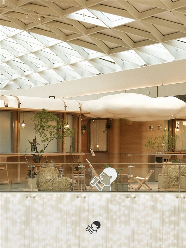 基于门店位处商业体中庭顶部的高空坐标,喜茶从经典产品元素“芝芝云顶”与cake lab的松软产品属性中提取造型灵感,在门店场景内融⼊云朵、餐车、茶箱和草垛等自然设计,将传统的制备区打造为一辆临时停靠的“云上列车”,外摆客座区的开放式设计模糊了门店与商场公共空间的边界,以轻盈、放松的场域氛围,为到访用户提供一个从快节奏的城市环境中短暂抽离的休闲空间节点。