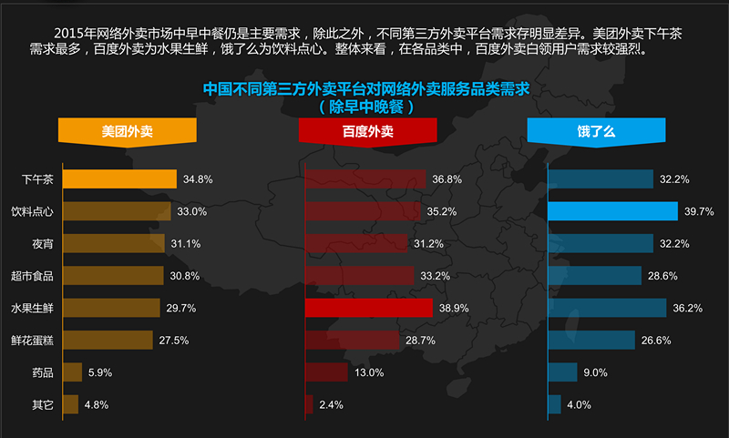 这组数据说明了白领用户已经不再是单纯的早中晚餐的需求,而是进化到了向下午茶、点心、夜宵、超市、水果、生鲜、鲜花、蛋糕、药品等多元需求。很明显这些需求是校园市场中偏少的,在校园内奶茶店、点心店、超市、水果店、蛋糕店等到处都是,无需外卖市场,并且校内市场更能掌握学生市场的低价位的市场,而外卖平台所提供的产品价位相比较高,并不是校园市场的主要需求所在,而这只会是白领们的选择,唯有白领市场可以扩大同城生态配送的市场。