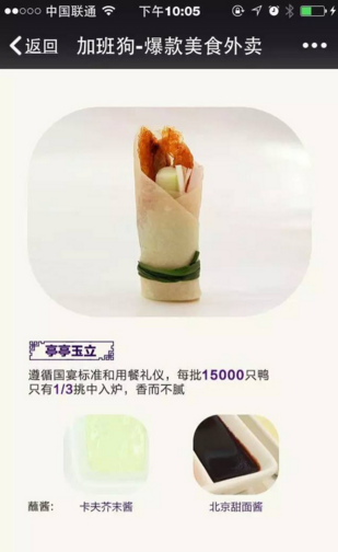 据小鸭哥运营方——北京鸭哥科技有限公司(以下简称“鸭哥科技”)总经理杨艾祥介绍,为了解决烤鸭配送到消费者手中变凉的难题,他们特制了一种加热包并取得了专利权,加热包遇水能够释放温度高达90摄氏度的蒸气。消费者用餐时,只需将加热包放在鸭卷盒的下隔层进行反应,通过自加热方式及蒸气循环的原理,6分钟的二次即时加热,就能使其达到与堂食烤鸭65摄氏度相仿的适口温度。此外,手工卷制鸭卷的形式,也解决了懒人用餐的用户需求。而且,他们还突破传统的面酱味型组合,提供年轻人喜欢的卡夫芥末酱,增加鸭卷的复合口感,对传统烤鸭进行全面的外卖化升级。