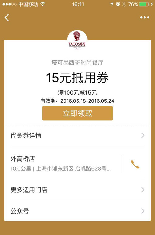 塔可在微信后台内投放了1000张15元代金券(消费满100元即可使用)。首次关注公众号便可领取。半个月内共被领取了 700张,领取率达70%。