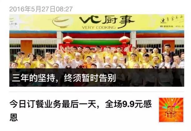 5月27日,立志做“餐饮界京东”的外卖店VC厨事在公众号上发表声明:转让300平米的中央厨房,公司也打包出售。