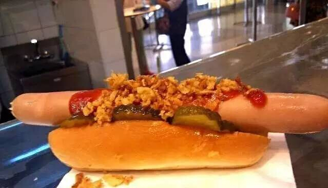 3元的热狗,性价比之王,已经划算到哭。面包是加热过的,热狗是水煮而不是油炸的。从吧台拿到热狗后,可根据自己的口味随意加酱,芥末酱、番茄酱都广受欢迎。一般有两台加酱机器,挤多少都可以,旁边还附带纸巾,不是一般的贴心。