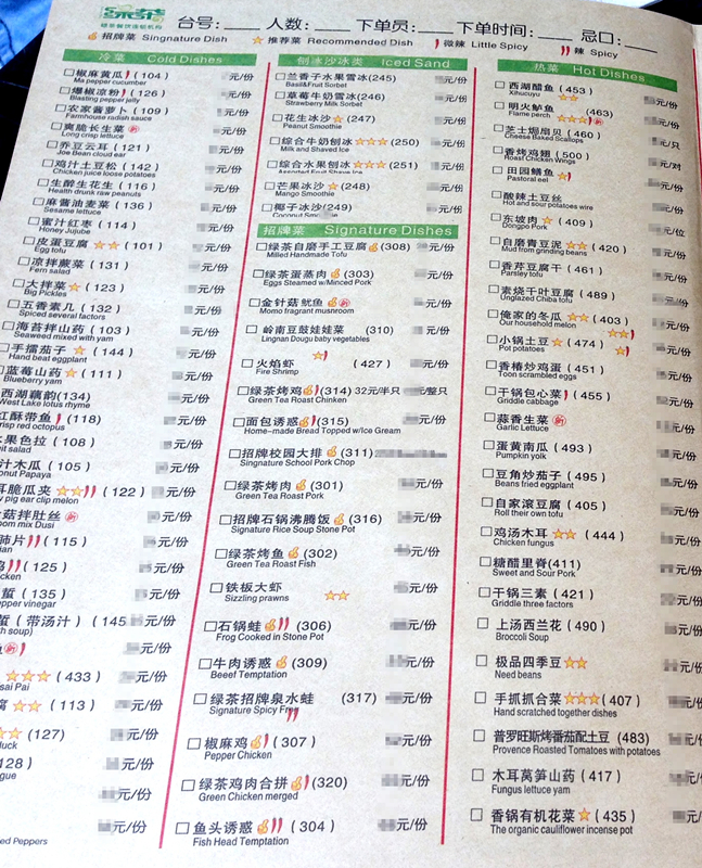 绿茶的菜单都是密密麻麻的菜品名和价格。面对上百种菜色,顾客自然会难以抉择。这时,在色彩单调的菜单上,用明亮突出的另类色彩和浅显易懂的标记对菜品做出隐形排序,无形中也引导了顾客的消费。
