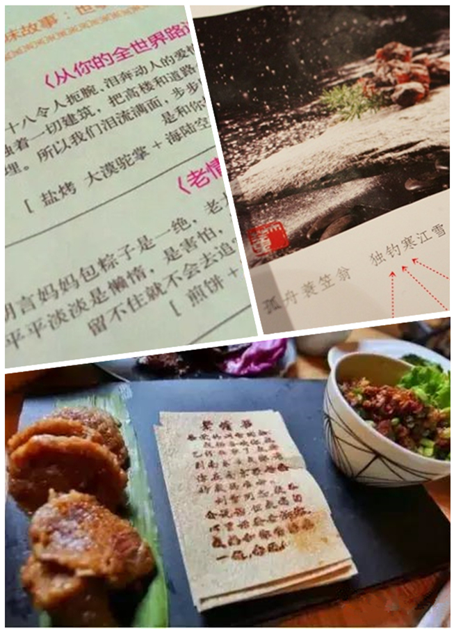 此外,那些热门小说家开的“小说餐厅”,像张嘉佳的“从你的全世界路过”、韩寒的“很高兴遇见你”等等,菜单上的菜品名都是与小说情节有关的词句,但从词句上很难看出这道菜的“真面目”。这样会讲故事的菜单,让人们在阅读菜单时有了浓重的代入感和好奇心,也因此对菜品更加印象深刻。
