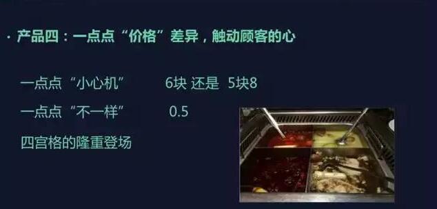 ②一点点“不一样”在定价的角度观察顾客需求。很多顾客在吃火锅的时候喜欢吃不同的品种,但品种如果是一份的话分量大,吃不完,我们就推出了半份,让客户有更多的选择。除了能让顾客尝试更多的品种,也不会造成浪费。