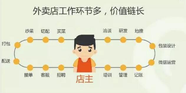 3、餐饮人普遍缺少高效、稳定的供应链——需要管理的流程过多过杂,包含切配、买菜、洽谈、研发、地推、记账、管理、培训、招聘、客服、接单、配送等十几个环节。