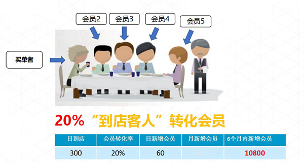 以前办会员卡都是一个人去买单,他可能只会办一张会员卡,也许只有一个人有积分,相应的就只有他一个人有优惠。对于互联网来说,我们希望买单者的陪同者也可以变成我们的粉丝,也就是我们的会员。假如说每天到店的消费者有三百个人,而会员的转化率基本不会低于20%,我们可以通过这样的方法把20%的人变成你的会员,相当于每天都新增60个,半年就会有10800个,互联网会员对于积累粉丝来说是低成本、高效率的,20%是最基本的吸粉比例。