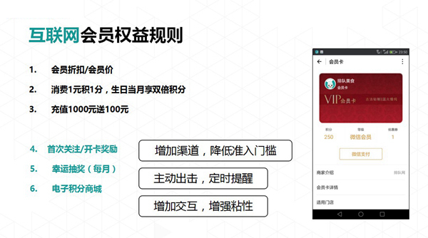 接下是设计一套会员权益,设计会员权益的目的是将会员的弱关系变成强关系,提升活跃度,所以每一步设置都应该一步步地引导会员。另外,我们的会员是通过微信会员卡对接的,等于说消费者办的是微信卡包的会员,同样有积分、优惠,是可以进行合销兑换的。这样一来,不仅提升了互联网营销的功能,还降低了办会员卡的门槛。