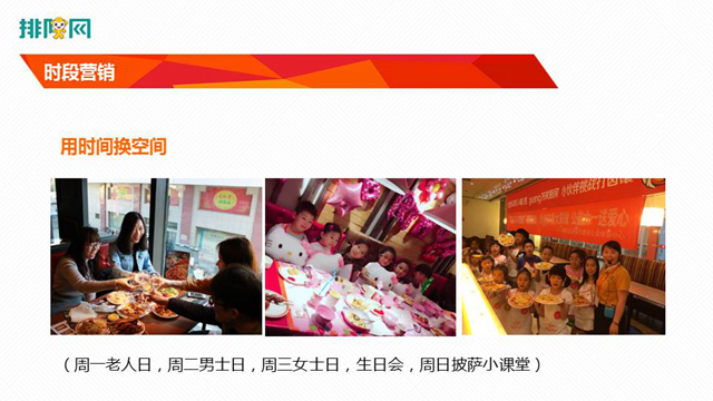 2.时段营销。餐饮人都有体会:周末销售都很好,而周一到周五生意就差一些。我们就想着怎么把周一到周五的生意做好。我们想到了用时段营销。周一到周五不用排队,我们可以吸引对价钱敏感而时间充裕的人来就餐。让他们不在高峰期来,而在低峰期来。我们设定老人日、男士日、女士日、生日会等等,一些价格敏感型人可能就会在不同时间来,大大提升了周一到周五的客流。