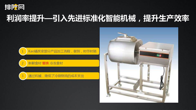 同时我们做了改革,将部分标准化设备放到我们的店内完成,降低流程。大家做供应链的时候,发现有一个成本特别高的,就是冷链物流成本。KAO铺为了规避冷链物流成本特别高,就将很多生产环节放到门店自己来进行预制,这样就能节省我们的物流支出。