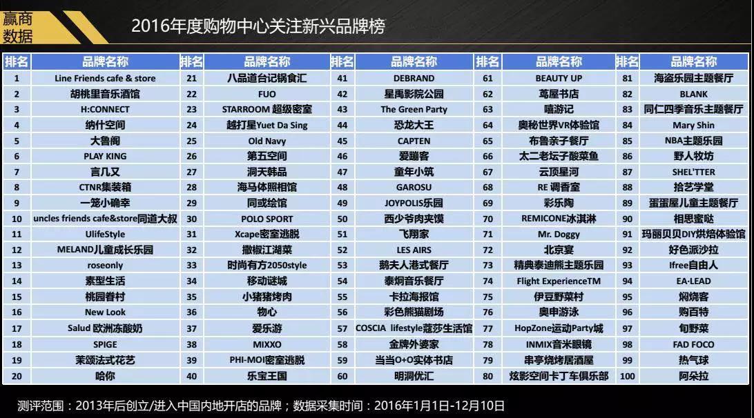 根据赢商大数据中心2016年12月发布的年度度购物中心关注新兴品牌榜,以下这100家至Top新兴品牌你都拔草没?