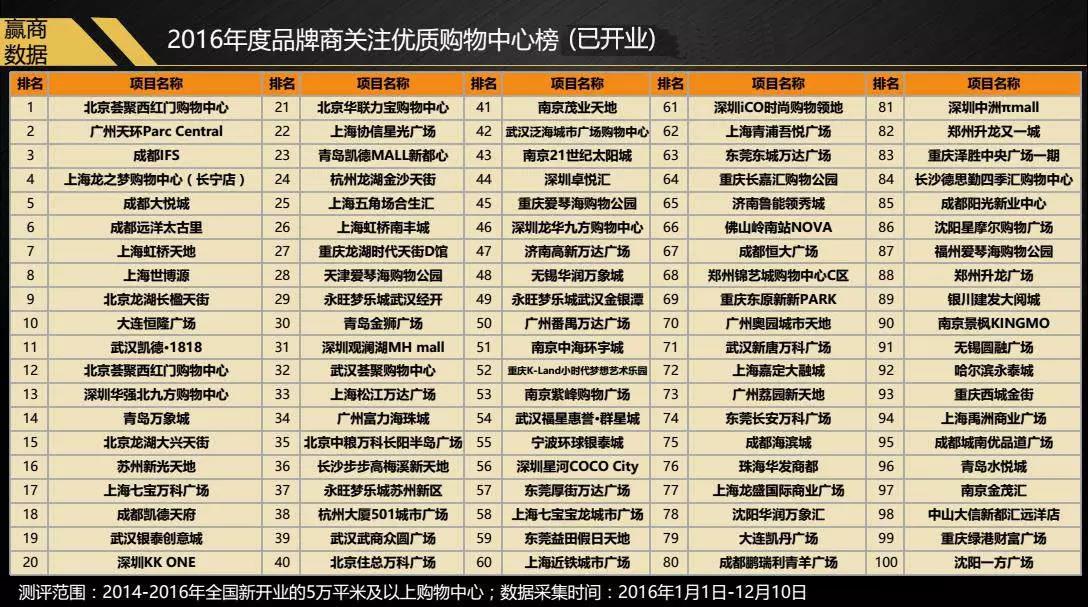 年度品牌商关注优质购物中心榜(已开业),是根据购物中心所在城市商业能级、所处商圈级别与消费力指数、消费人流到达指数、已进驻指标性品牌实力指数、创新业态进驻指数、稀缺业态与独有品牌进驻指数,以及所属开发商开发运营综合实力、租金、出租率、坪效、年营业额等,并结合购物中心在赢商数据库的年度浏览数据、互联网热词搜索量等进行综合测评。