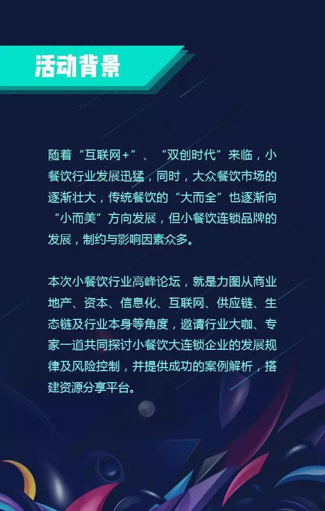 通过精彩演讲、尖峰对话等多模式实现信息共享,更多看点、更加精彩,创造最具丰富性和影响力的中国小而美餐饮行业峰会。