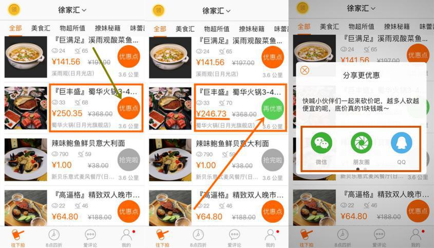 爱抢购有着独创的砍价模式,用户可以主动抢购你的商品和服务,点击一次即可砍价,如果还想要更低,那就要利用微信等社交渠道来传播、分享,让更多人参与砍价,无形中形成线上矩阵式扩散,传播力度更大。