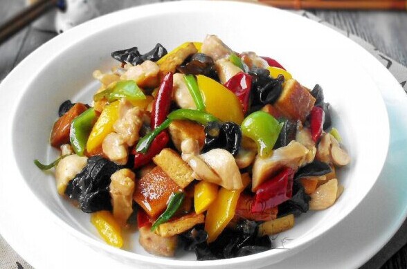 6. 再热油锅,把鸡肉放锅中炒至变色盛出;