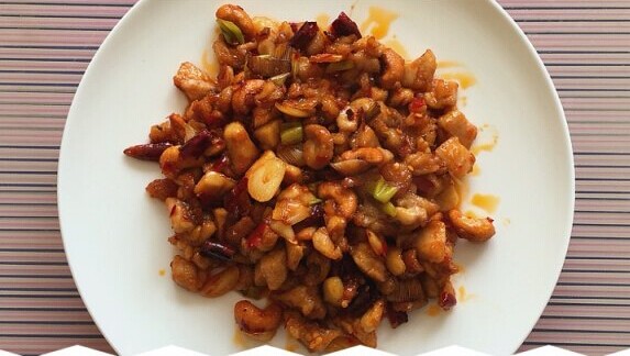 5. 倒入葱姜蒜炒香,倒入鸡丁反复翻炒直至鸡丁缩水后熟至金黄色;