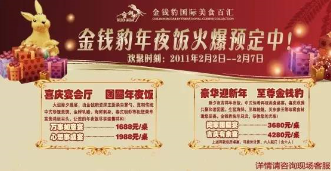岁首年终,美好的开始金百万为你奉上最美味的年夜饭贴心的服务,只为让您在大年夜里吃的开心,吃的放心让您在新的一年里有个美好心情猴年大吉!