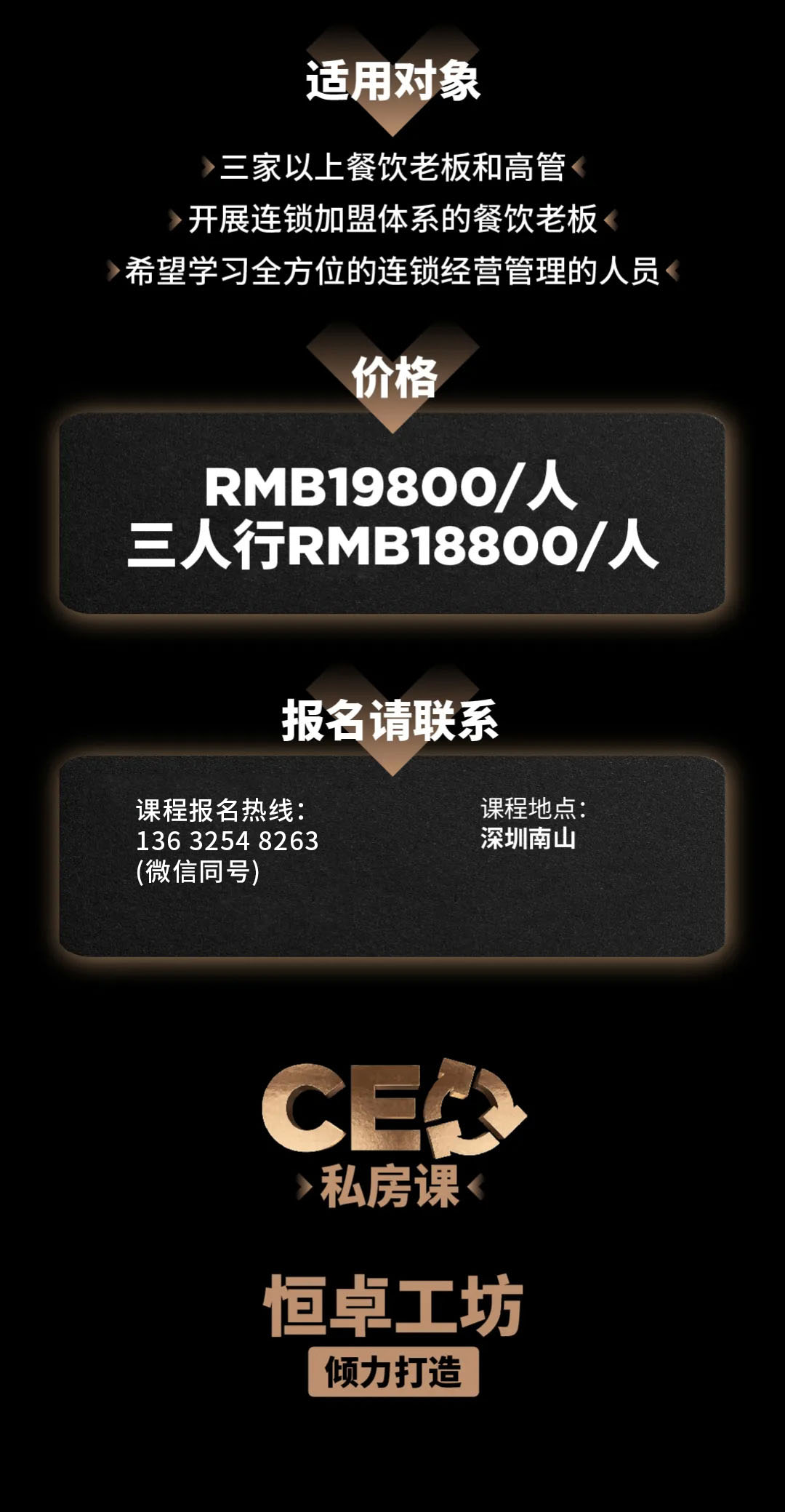 这三天课程,从9大模块,6大案例分析,并提供了12个关键工具包,让每个餐企老板对自己的未来连锁之路更加清晰!