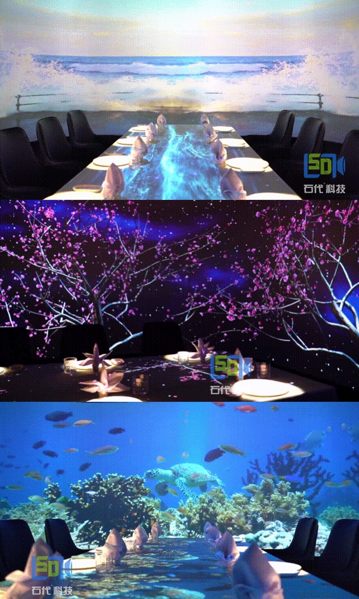 而开头提到的天玺·桃花源餐厅就是用石代科技5D全息投影技术完成,身在餐厅能看到巍峨的崇山峻岭,立体环绕音质系统会让你听到溪水潺潺的流水声,还有风儿吹动竹林的沙沙声……