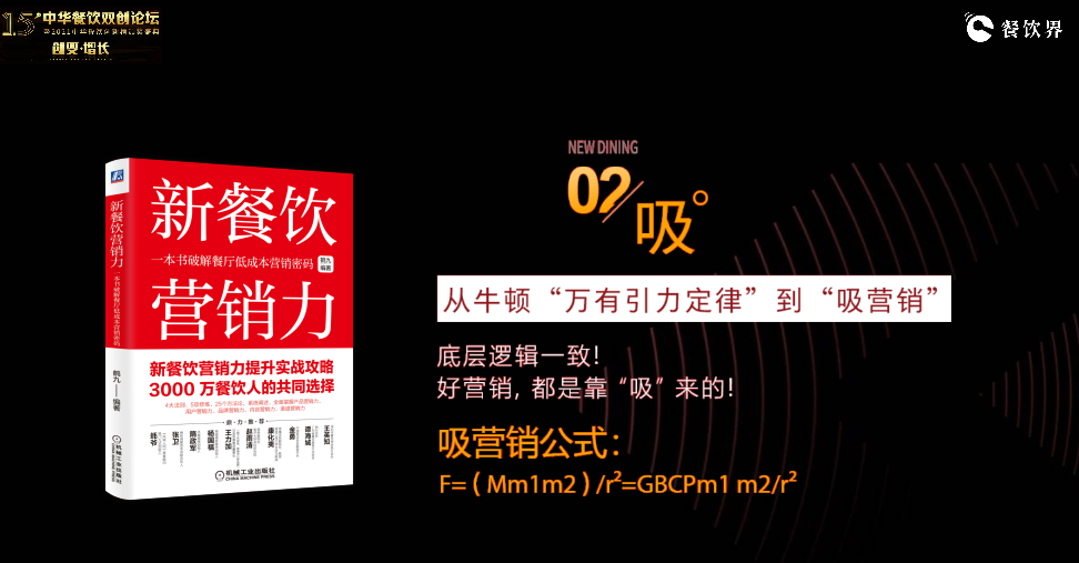 我在我的新书《新餐饮营销力》里首次提出了“吸营销”理论。这里边的“吸”,跟牛顿万有引力定律里描述的”任何物体之间都有互相吸引力”原理几乎相通。我们设想一下:牛顿万有引力公司是F=GM1M2/r²,这里的M1M2分别是两个物体的质量,r是两个物体之间的距离,质量越大、距离越短,两个物体之间的吸引力就越强。而在商业环境中,M1代表营销主题的“产品力”,M2应当是目标用户对产品的“需求力”,r应当是营销信息与目标用户之间的传播路径。