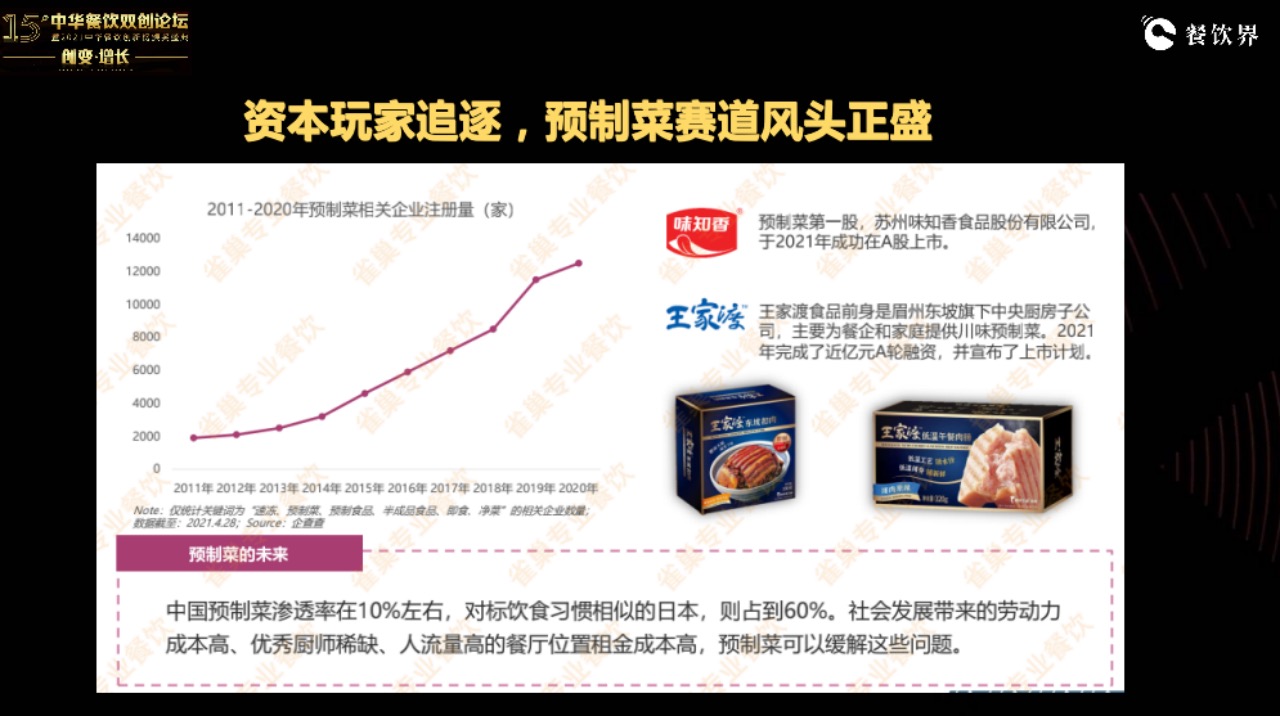 我们通过企查查数据统计,2011-2020年,预制菜相关企业注册数量,从2000家增加到12000多家。在2021年,我们看到中国预制菜第一股味知香在国内A股上市,估值超100亿。