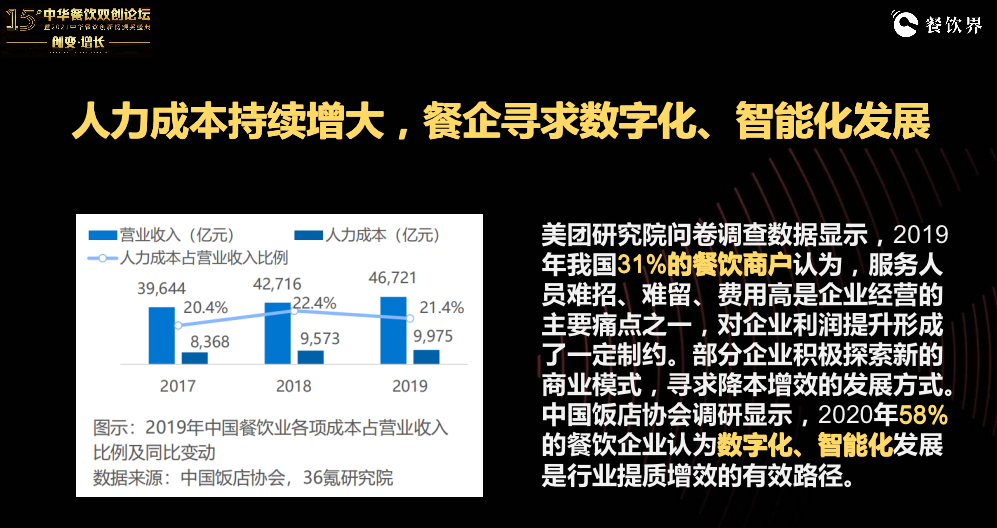 我们在开篇的一组惊人数据中,我们已经得知,中国餐饮行业4大成本结构每年都在递增。对此,美团研究院问卷调查数据显示,我国31%的餐饮商户认为,服务人员难招、难留、费用高是企业经营的主要痛点之一。而中国饭店协会调研显示,2020年58%的餐饮企业认为数字化、智能化发展是行业增效的有效路径。