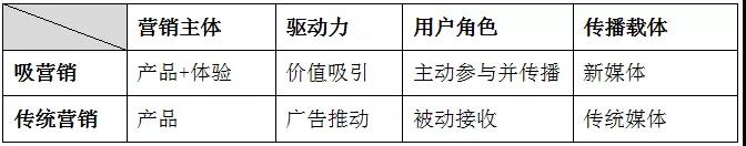 传统营销多基于产品自身,往往表现为利益驱动,而吸营销则多基于用户和体验,往往表现为价值驱动。