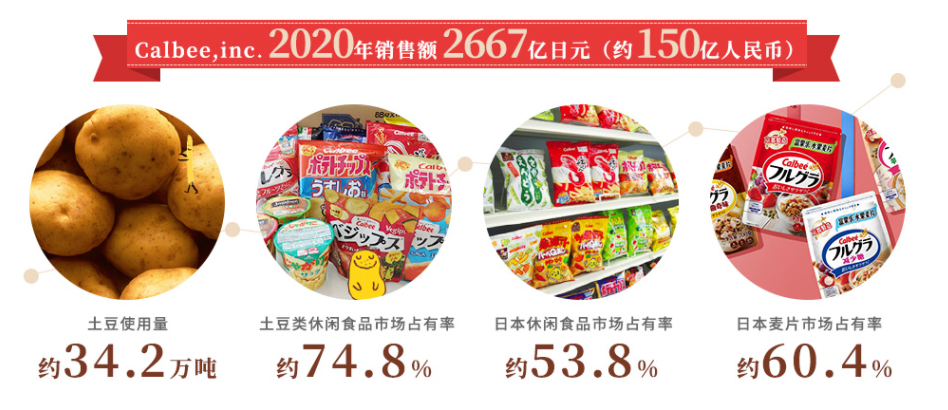 卡乐比Calbee品牌于1949年成立于日本广岛,覆盖休闲食品和麦片系列。已经73岁的卡乐比在销量和口碑上遥遥领先,,堪称日本国民零食品牌。一年的土豆使用量就到达惊人的34.2万吨,土豆类休闲食品市场占有率约74.8%,在薯类零食这一赛道,卡乐比已经遥遥领先。