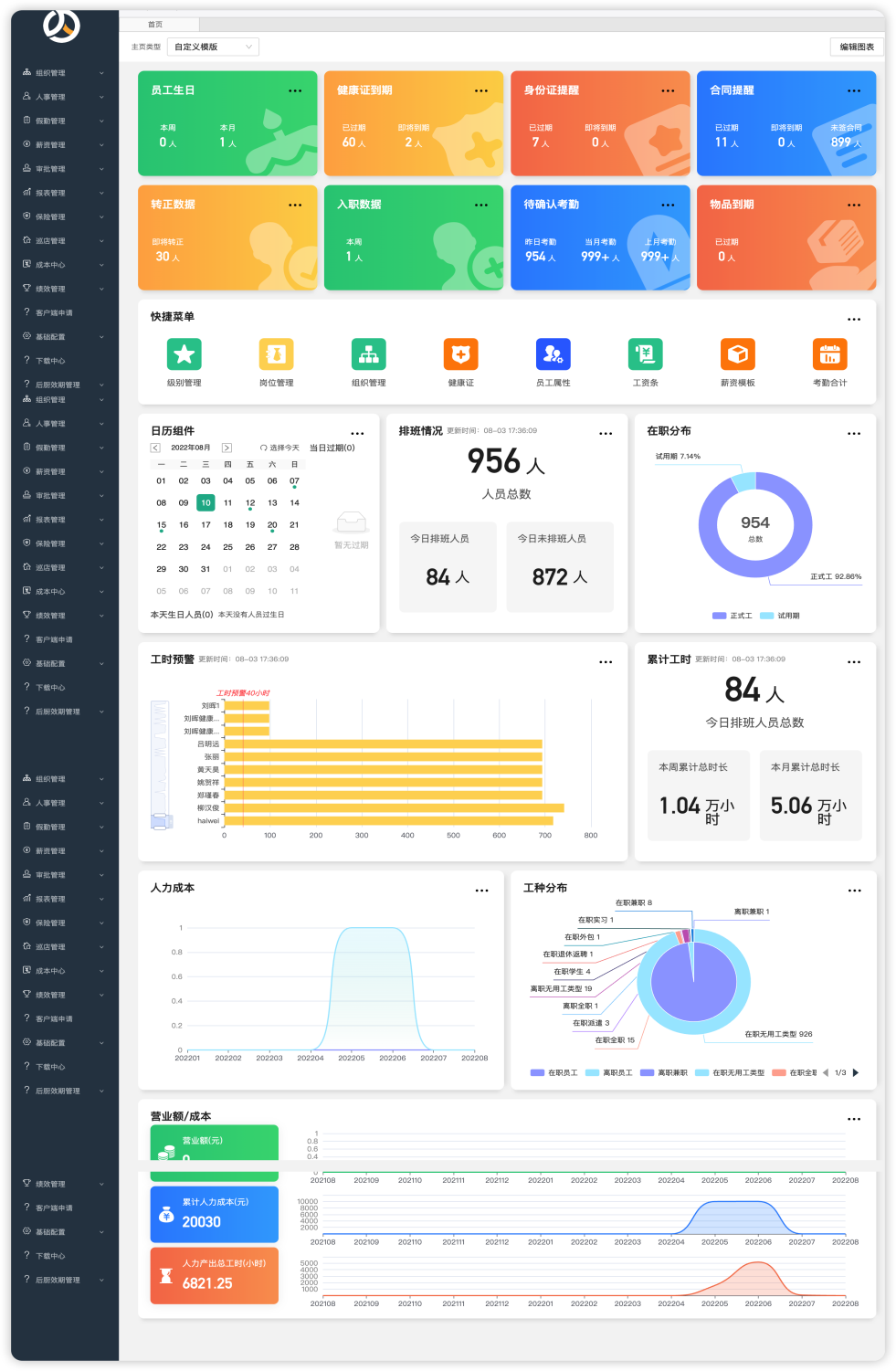 首页自定义仪表盘相当于人事通全模块的“数据集成看板”,将各模块数据通过柱状图、折线图、线性图等形式进行可视化地分析展示,从而有效地辅助业务决策。