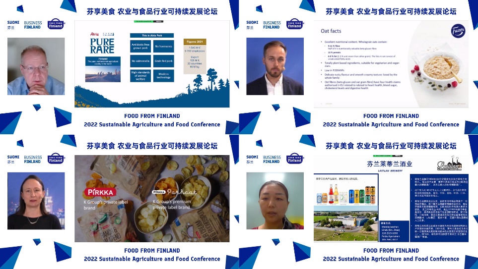 本次研讨会,邀请了Atria阿特睿、HKscan、Kesko凯斯科自有品牌Pirkka及与Kesko凯斯科跨境电商店铺合作的品牌x 4 Olvi, Halva, Bonne Juomat和Leipomo Rosten、Fazer Mills菲泽、Valio蔚优、Teerenpeli、One Eyed Spirits、Laitilan Wirvoitusjuomatehdas莱帝兰、Roberts蓝宝氏共13家龙头企业参加。来自这些龙头企业的相关负责人在线上各抒己见,通过炉边会议、路演分享等形式,共同探讨食品行业的可持续发展之道。这里整理摘录出了炉边会议和路演分享的精华部分,以供大家共同参考学习。