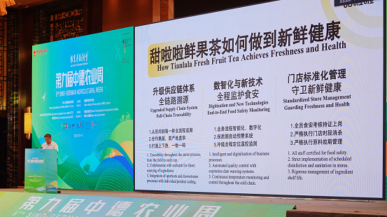 记者从现场了解到,茶饮品牌甜啦啦受邀参加主题为“中德农商对话——农业价值链转型升级”论坛,会上,安徽汇旺餐饮管理有限公司董事长、甜啦啦创始人王伟先生发表主题为“甜啦啦持续布局健康新式茶饮”演讲。他从三大维度、六个模块,详细阐述茶饮品牌甜啦啦在食品安全、绿色低碳方面的社会贡献。他表示,甜啦啦成立九年以来,十分注重食品安全与产品质量,运用智能化、信息化管理布局,促进茶农、果农价值链可持续发展。现场,王伟先生介绍道,甜啦啦持续升级供应链体系,溯源物料产地,从源头把关舌尖安全。