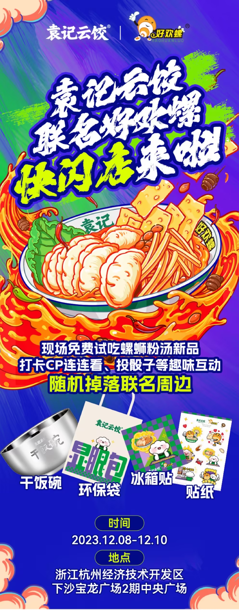 为了让更多宝子们有机会体验到酸爽好吃的联名新品,12月8日至12月10日,袁记云饺X好欢螺以“喜结良「袁」,「欢螺」开炫”为活动主题,在杭州开展“螺蛳粉汤全家福饺子/云吞新品”试吃餐车快闪活动和「小袁宝」「小螺仔」IP人偶快闪活动,现场还设置了众多互动小游戏,参加即可赢取联名周边奖品。宝子们,我们在杭州活动现场不见不散!