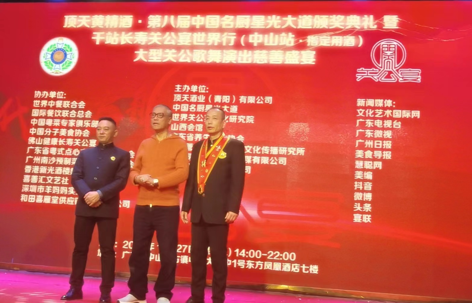 来自五湖四海的关公文化友人,志同道合的同行,倘若你发问:今天(2023年12月27日)为什么选择莅临顶天黄精酒·第八届中国名厨星光大道颁奖典礼暨千站长寿关公宴世界行(中山站)大型关公歌舞演出慈善盛宴,那么我可以坦诚的告诉你,因为赤子之心的凝聚,因为群英荟萃,三人行必有我师。这里是餐饮人点燃激情展现才华的“紫禁之巅”……是餐饮之“道”让我们聚在一起,缔造华夏旖旎的靓丽风景线,去年"第七届中国名厨颁奖典礼暨首届千站长寿关公宴世界行(广州站)"在广东迎宾馆已成功举办,今天(2023幸12月27日)顶天黄精酒·第八届中国名厨星光大道颁奖典礼暨千站长寿关公宴世界行(中山站)大型关公歌舞演出慈善盛宴,在中山古镇东方凤凰酒店隆重举行。国际餐饮联合总会会长胡珠、顶天酒业(青阳)有限公司董事长王浩然、世界警察博击大赛冠军邢金喜、世界龙冈刘关张赵管委会主席张景耀、中山古镇镇党委副书记吴国森、广东同捞同煲文化传媒有限公司董事长陈浩全、世界关公文化品牌协会会长成耀军、山西会馆董事长高绍军、广州市南沙区预制菜进出口贸易协会会长肖盛龙、国际关公文化协会主席马小平、香港山西商会会长吴腾、香港警察队员佐级协会总部总区副主席关其海、山东滕州市税务局局长关祥勇、山西省人民政府驻广州办事处党组书记主任王世超、珠海市餐饮协会原会长常胜、珠海市餐饮协会会长邵力、中国美食协会广州分会会长陈土全、鹤山市餐饮行业协会会长胡润勤、中国大导演王星军、南方卫视《我爱返寻味》主持人舅父新、开平关族图书馆管委会主任关在练、佛山关公文化协会执行会长高春旭、香港四大美食家四哥、深圳羊妈妈实业有限公司董事长何玉清、珠海市厨师协会理事长林毓海、顺德名厨会秘书长奔州强等嘉宾出席本次活动。