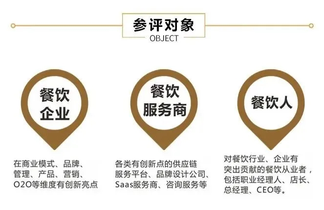 餐饮企业:在商业模式、品牌、管理、产品、营销、O2O等维度有创新亮点的餐饮企业,“品牌创新榜”为你虚位以待;餐饮服务商:各类有创新点的供应链服务平台、品牌设计公司、SaaS服务商、咨询服务等,“服务创新榜”正静候佳音;餐饮人:针对餐饮行业、企业有突出贡献的餐饮从业者,包括总经理、CEO、行政总厨等有创新力的个人,“创新领袖榜”上该有你的风采。