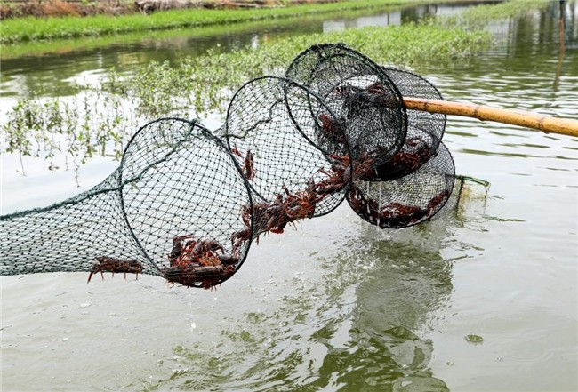 在位于潜江市秀河村的新柳伍万亩虾稻共作基地,养殖池里棋盘式分布着捕虾网,岸边整齐码放着专用于小龙虾养殖的灯笼草和扁担草。养殖池虾稻共作、水草喂养,这是潜江小龙虾营养丰富、肉质鲜嫩且绿色环保的独家“秘诀”。